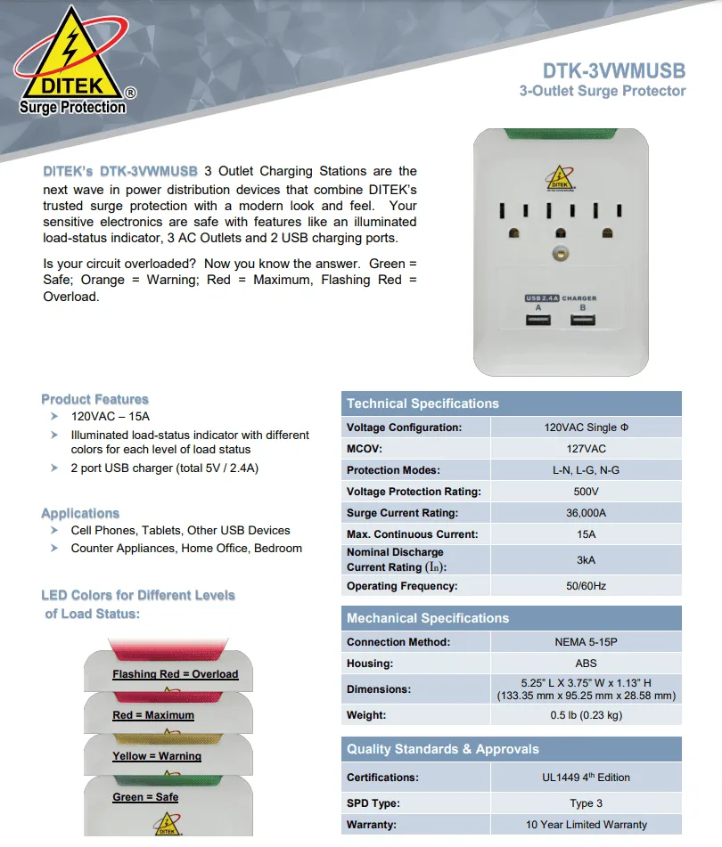DITEK’s DTK-3VWMUSB is a three outlet charging station with load sensing technology. Illuminated load-status indicators for each level of load status.