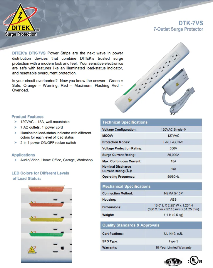 DITEK’s DTK-7VS is a seven outlet power strip with load sensing technology, and illuminated load-status indicators for each level of load status.